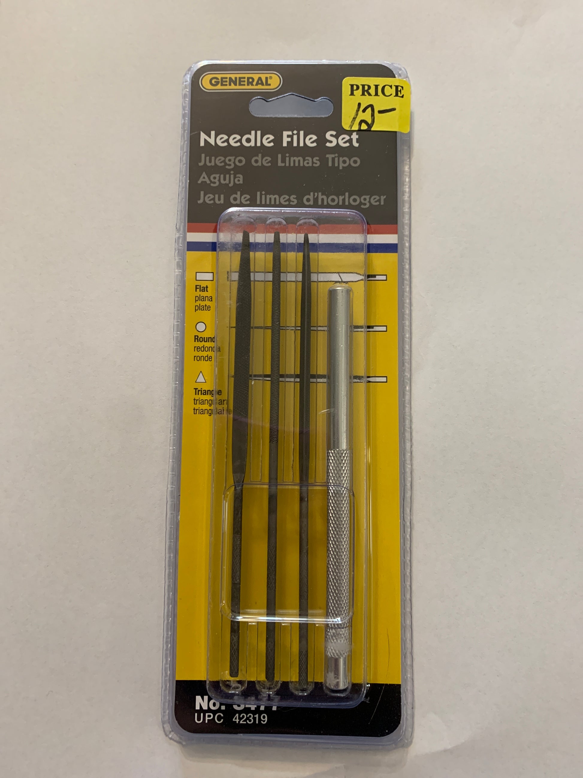 4 piece needle files set (3 files, flat, round, triangle) and handle