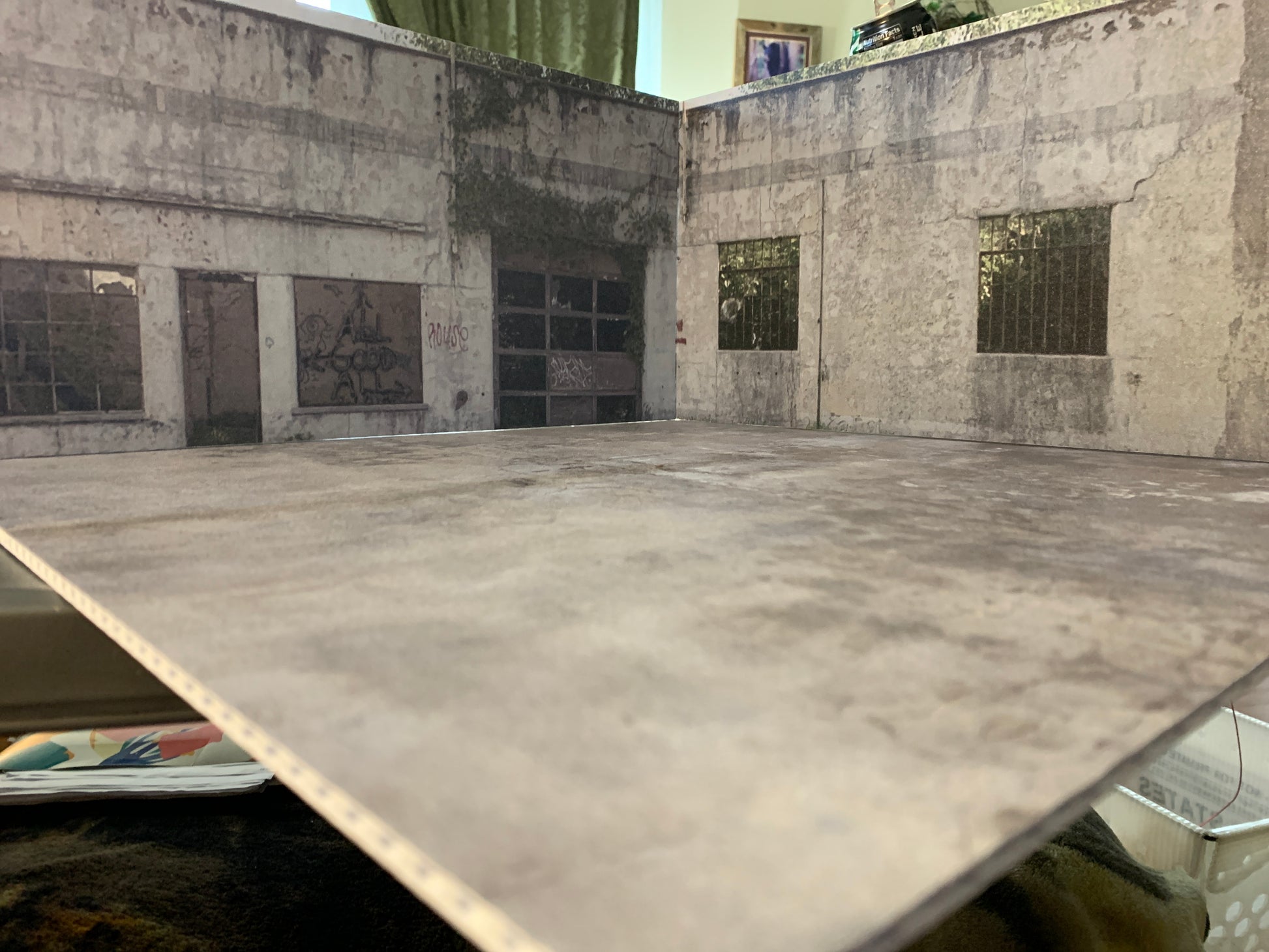 Heavy duty photo background of diner. Base measures 18x18 inches and sides are 9x18. Will store flat when not in use. Great for photographing your models at any angle & in any weather.